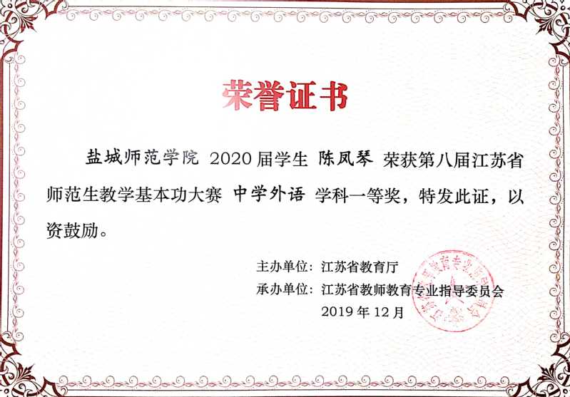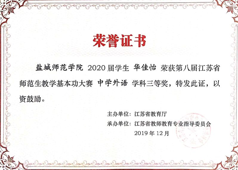 由省教育厅主办、江苏省教师教育专业指导委员会承办的第八届江苏省师范生教学基本功大赛已经圆满结束,开云网页版页面陈凤琴、程旭同学获得中学外语组一等奖 ,华佳怡同学获得中学外语组三等奖。