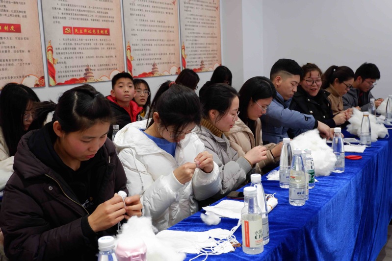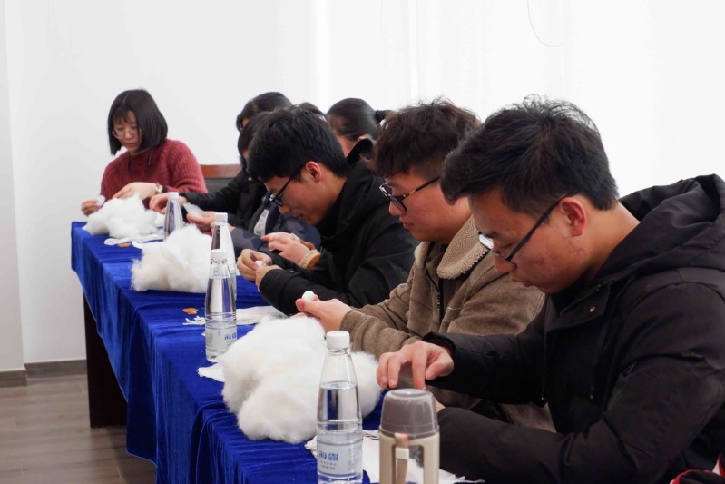 会上,杨馆长作总结讲话时,代表海盐博物馆感谢全体志愿者朋友对文博工作的大力支持与辛勤付出,并对2020年度志愿者工作提出了要求。“拓包制作体验交流”环节中,志愿者们观看教学视频学习如何制作拓包,每一位志愿者小心翼翼地裁减棉布、包扎棉球、捆扎拓包。志愿者们现场制作拓包252个,为后期的 “对话文物” 社会教育活动提供了拓印材料。