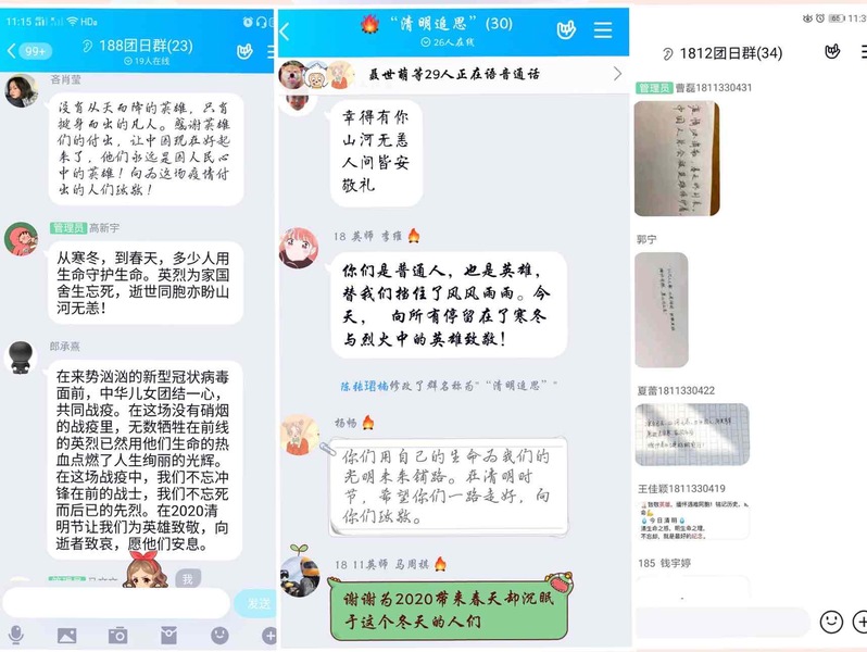 默哀后,各团支部通过QQ视频连线,纷纷发表云寄语表达对抗疫英雄的敬仰与哀悼,对英雄们倾尽生命进行抗疫的精神表示敬佩。院学生会主席张磊表示,这个时代不缺乏英雄。逆风前行的人还有很多,这些可亲可敬可爱的人,用他们的血肉之躯筑起“疫线”长城。畏惧是本能,但无畏是信仰,哪有什么岁月静好,只是有人为我们负重前行。“没有从天而降的英雄,有的只是挺身而出的凡人。虽然我们没有身处疫情第一线,但我们作为当代青年,我们要以身作则,服从大局听指挥,尽己力,分国忧。”189班团支书温璐依在班级清明追思群说。