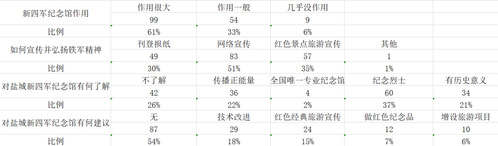 实践调查结果显示,多数人认为新四军纪念馆对于弘扬铁军文化机构积极作用。大家一致认为,网络宣传,红色景点宣传是弘扬铁军文化的有效宣传方式。在群众眼里,盐城新四军纪念馆能传播正能量,纪念烈士,具有一定历史意义,但遗憾的是,仍有少部分人不了解。对于盐城新四军纪念馆,大家普遍标志很好,少数人建议应增添红色旅游景点。群众认为,红色文化在多数情况下具有积极作用,多数人对红色革命根据地有所了解。