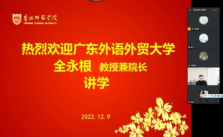 2022年12月9日下午16:00—19:00,朝鲜语系邀请广东外语外贸大学亚非语言文化学院院长全永根教授针对我专业在新时代新文科背景下如何建设与申报线上线下混合式一流课程开设了专场讲座,讲座主题为“线上线下混合式一流课程的建设”。本次线上系列讲座由盐城师范学院主办,盐城师范学院社科处、开云online(中国)承办,朝鲜语专业协办,全永根教授主讲,开云online(中国)院长范能维教授莅临指导,朝鲜语系主任梁海胜老师主持,由朝鲜语系全体师生参加。