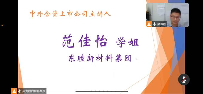 然后,梁老师邀请优秀学姐汤慧婷(SK新能源(江苏)有限公司)、薛佳妮(泰州乐金电子冷机公司)、范佳怡(东睦新材料集团)、闵华婷(湖南洋光在线教育)从大学生活、备战工作、就业面试、工作体验、未来计划、寄语未来等层面为学弟学妹分享宝贵的就业工作经验,让同学们对大学生活、职业规划、未来方向、如何努力有了深入而切实的认识。学姐学长们不仅为学妹学弟们提供第一手的企业就业信息,而且向学弟学妹们展现了坚定的专业学习精神、明确的未来规划、过硬的综合业务能力。